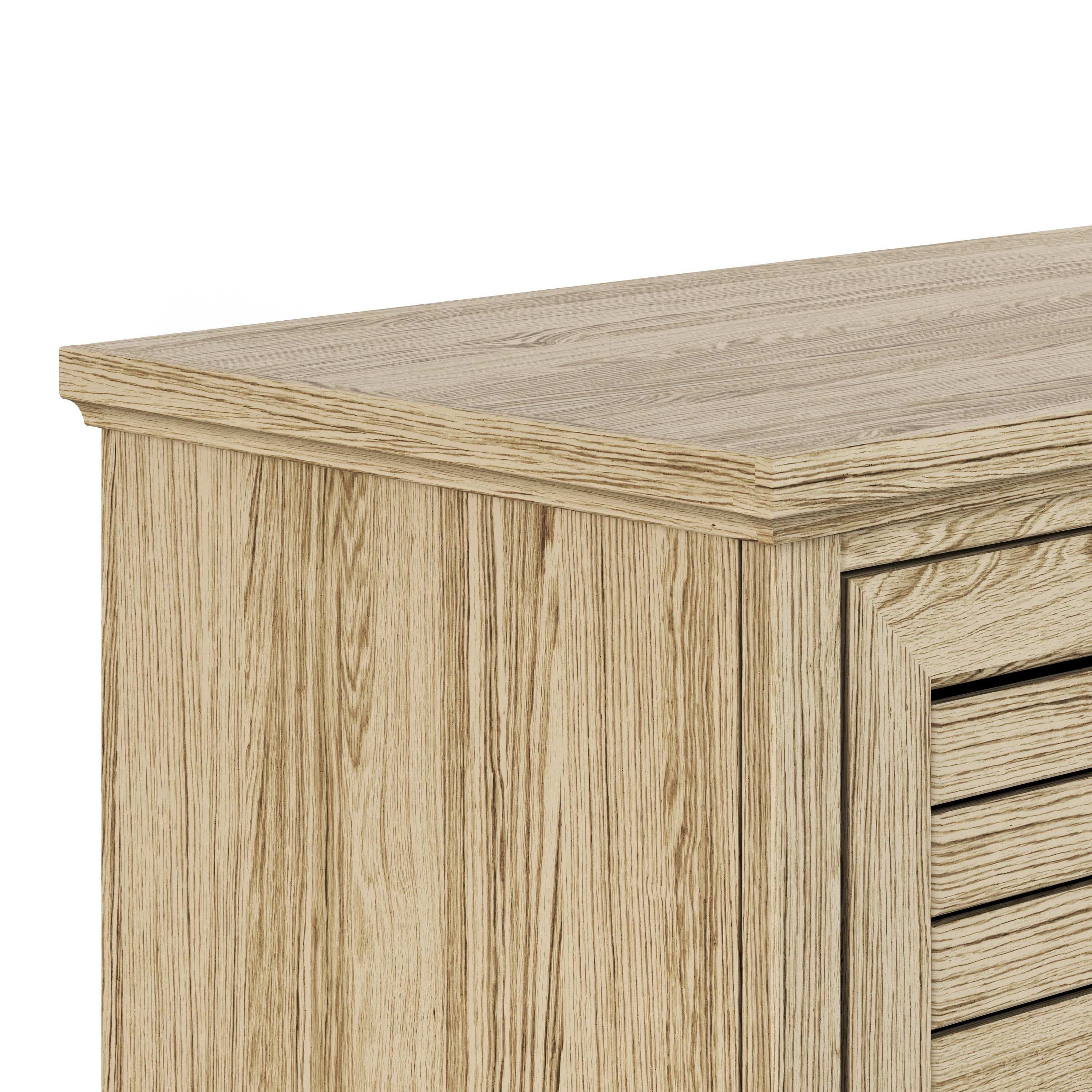 Bring home rustic, coastal style with the Topanga 83 inch Fireplace TV Stand Console from Bridgevine Home. This TV Stand is crafted from Oak Solids and Veneers in an Alabaster finish and features two doors with shutter slat detailing, two shelves and Antique Bronze hardware. This fireplace TV Console will accommodate TVs up to 95 inches and provide ample storage for media and gaming consoles and home décor favorites. Cable management openings on the back panel will keep your cords and wires concealed. The 42 inch electric fireplace insert includes a remote control and multiple settings allow for heat up to 400 square feet. Four (included) screws make securing the fireplace insert to the console quick and simple. The highly grained texture, natural imperfections and unparalleled craftsmanship will ensure this TV Console is a unique addition to your home.